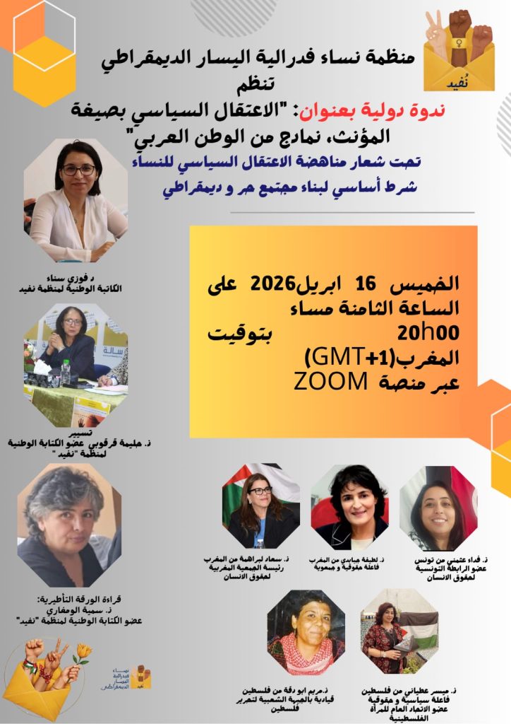 تنظم منظمة نساء فدرالية اليسار الديمقراطي، مساء اليوم الخميس 16 أبريل 2026، ندوة دولية رقمية تحت عنوان: “الاعتقال السياسي بصيغة المؤنث، نماذج من الوطن العربي”، وذلك عبر منصة “زوم”، ابتداء من الساعة الثامنة مساء (توقيت المغرب)، في إطار انخراطها المستمر في الدفاع عن قضايا النساء وتعزيز حضورهن في مسارات النضال الديمقراطي والحقوقي.